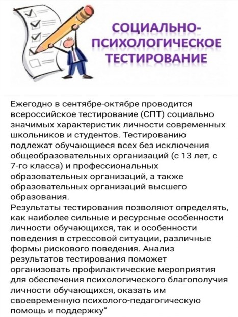 С 16 сентября в школе будет проходить обязательное социально-психологическое тестирование детей (СПТ). Тестированию подлежат все школьники с 13 лет, обучающиеся 7-11 классов. Перед его началом необходимо заполнить информированное согласие (отказ) на прохождение. Школьники с 15 лет заполняют согласие самостоятельно, детям, не достигшим 15-летнего возраста, согласие заполняют законные представители (родители).